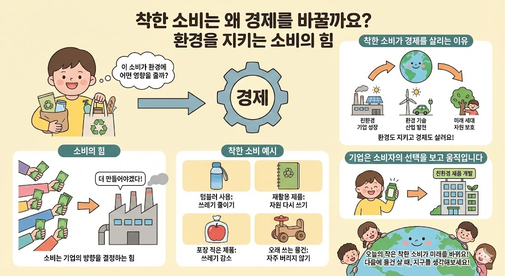 착한 소비는 왜 경제를 바꿀까요? 초등학생도 이해할 수 있도록 환경을 지키는 소비의 의미와 예시, 소비자의 선택이 기업과 경제에 미치는 영향을 쉽게 설명합니다.